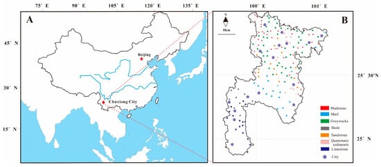 Chuxiong city lies east of the Hengduan Mountains in southwest China (N 24°13′00″–26°24′00″, E 100°44′00″–102°2′00″) (Figure 1). The average annual temperature of Chuxiong city ranges from 14.8 to 21.9 °C []. Precipitation is relatively meager, with an average annual precipitation of 800 to 1000 mm, and is mainly concentrated from July to October []. The sampling area is primarily situated in the Yangtze landmass–Upper Yangtze Paleo-landmass, and the tertiary tectonic units pertain to the Chuxiong intracontinental basin and Kangdian basement uplift belt from west to east [].
