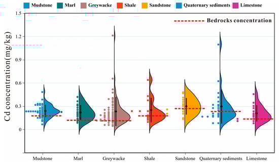 These findings suggest that bedrock types may influence Cd concentrations in soil. The concentrations of Cd in different types of bed rocks are shown in Figure 2, and are as follows: sandstone of Gaofengsi (K1g) (0.28 mg/kg) > alluvial deposits of Quaternary Holocene (Q) (0.20 mg/kg) > mudstone of Changhe (K1p) (0.18 mg/kg) > shale of Luojiadashan (T3l3) (0.17 mg/kg) > limestone of Yunnanyi (T3y2) (0.12 mg/kg) > marl of Tongzhanghe (J2Z2) (0.12 mg/kg) > greywacke of Jiangdihe (Kej1) (0.11 mg/kg). The concentration of Cd in bedrocks constitutes a significant factor influencing the concentration of Cd in soil. It is notable that the Cd concentration in the soil does not precisely correspond to that in the bedrock. This disparity might suggest that the variations in the weathering resistance among different bedrock types also exert an influence on the observed Cd concentrations in soils. The concentration of heavy metals resulting from the weathering of various bedrock types can vary considerably [,,]. An analysis of the distribution of Cd across diverse soil types derived from distinct bedrock sources reveals that siliceous soils show a greater tendency for Cd migration compared to carbonaceous soils []. In southern China, the heavy metal concentrations within sandstone are markedly higher than those present in the soils formed through slate weathering processes []. In eastern China, when black shale and carbonate rocks serve as parent materials, the Cd concentrations are substantially elevated, in contrast to those associated with other types of bedrock []. Consequently, a comprehensive understanding of the weathering processes affecting bedrock is indispensable for accurately assessing the sources and contributions of Cd in soil. Additionally, variations in anthropogenic inputs represent another crucial factor influencing the Cd concentration in soil []. To elucidate the geochemical behavior of Cd in different bedrock contexts, it is essential to initially delineate the sources and contributions of Cd within various regions.