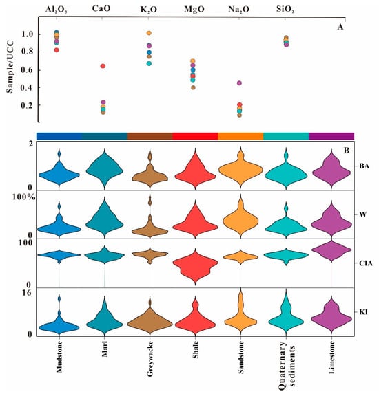 The average composition of major elements in diverse soil samples was compared with that of the Earth’s upper crust (UCC) [], as depicted in Figure 4. With the exception of Al2O3 and SiO2, substantial losses are noted for the remaining major elements (MgO, Na2O, CaO, K2O), particularly for Ca and K2O, which exhibit the highest degrees of depletion. The liability of CaO and Na2O to weathering implies a distinct chemical weathering process []. And all soil types present a similar trend of variation regarding major elements (Figure 4A). This consistent trend indicates that different soil types within the same region share comparable weathering and deposition. However, variations exist in their respective degrees of elemental loss. For instance, relative to the crustal abundance, the degree of CaO loss follows the following sequence: shale (0.65) > limestone (0.23) > sandstone (0.19) > Quaternary sediment (0.15) > greywacke (0.14) > marl (0.14) > mudstone (0.13). Similarly, the loss of Na2O relative to crustal levels is ranked as follows: limestone (0.46) > shale (0.22) > marl (0.17) > sandstone (0.17) > Quaternary sediment (0.14) > mudstone (0.14) > greywacke (0.10). The loss of CaO and Na2O reflects the significant weathering loss of Ca- and Na-rich minerals such as plagioclase [,]. The main structure of feldspar is the silico-oxygen tetrahedron, which is influenced by numerous factors such as water and carbon dioxide during weathering, leading to gradual weakening of the lattice structure. Among them, Ca, K, and Na are prone to being lost in the form of acidic carbonate [,]. The difference in potassium oxide loss in sandstone (1.01) > marl (0.88) > limestone (0.87) > mudstone (0.79) > greywacke (0.74) > shale (0.66) > Quaternary sediment (0.66) reflects the loss of potassium-containing minerals, such as K-rich biotite, illite, and potassium feldspar. These differences may be ascribed to the varying weathering resistances among different rock types and their elemental compositions.