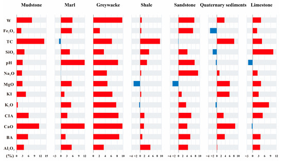 To quantify this process, we employed the leaching coefficient (W), dealkalization coefficient (BA), chemical alteration coefficient (CIA), and residual coefficient (KI) to assess the weathering degree of soils derived from different parent materials [,,]. The CIAs of various parent materials range from 65 to 85, and the reaction tends to fall within the medium chemical weathering level under warm and humid conditions (Figure 4B). The average alteration coefficient varies among different soil types, specifically shale (66) < limestone (68) < sandstone (75) < marl (78) < Quaternary sediment (79) < mudstone (79) < greywacke (80). The CIA indicates the degree of transformation of a mineral into a clay mineral [,]. The KI reflects the enrichment degree of stable elements [,]. These results are in line with those of the chemical alteration coefficient. Our findings demonstrate that the weathering degree of greywacke is the highest, while that of shale is the lowest. The disparity in weathering resistance is not only associated with its chemical composition but also closely tied to the rock structure [,]. Other distinct types of rocks, such as sandstone, mudstone, and shale, have different proportions of clay mineral particles and cements, as well as varying porosities, water permeabilities, and structural strengths among structures []. Shale is mainly composed of clay minerals and has an argillaceous structure. It is easily fractured by physical weathering but is less prone to further weathering []. And sandstone, greywacke, mudstone, etc., contain feldspar and other minerals susceptible to chemical weathering []. Shale has higher potential for weathering resistance than mudstone and sandstone. The W and BA coefficients reflect the migration of soluble elements []. The average dealkalization coefficient of the reaction is greywacke (26%) < mudstone (27%) < marl (30%) < Quaternary sediment (28%) < sandstone (33%) < limestone (48%) < shale (64%). There is good consistency between the results of W and BA (Figure 4B). These results suggest that under the same weathering conditions, soluble elements in heterolith, mudstone, and marl are more readily lost and preferentially form a large number of clay minerals, while limestone and shale retain more information from the bedrocks than the soil formed by heterolith.