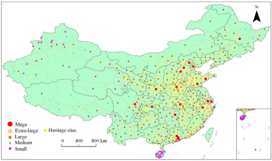 We chose 371 Chinese cities as our study area, including 23 provincial cities and 4 municipalities, as shown in Figure 1. The urban planning policy and related regulations are often conducted at the city-level, concerning the socioeconomic conditions and heritage protection needs. Moreover, the statistical data, e.g., census data, are more accurate at the city-scale, which further makes our chosen study area appropriate for the analysis. To take the different city scales into consideration, which may lead to different heritage protection regulations, we also divide our study cities into five categories based on their different population sizes: mega (≥10 millions), extra-large (5–10 millions), large (1–5 millions), medium (0.5–1 millions), and small (<0.5 millions).