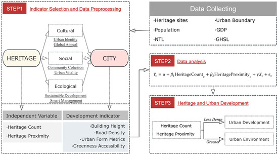Besides heritage site characteristics, we also looked into some socioeconomic and environmental metrics within the city. Some representative metrics are the average building height, population density, green space coverage, and urban forms. The overall research framework of this study is shown in Figure 2.