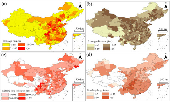 Distribution of some key variables: (a) heritage number, (b) average distance of heritages to city’s center, (c) walking time to nearest green park, and (d) average residential build-up height.