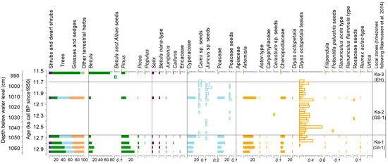 3.2. Kaatsjärv Plant Macrofossils and Pollen Diagram Description