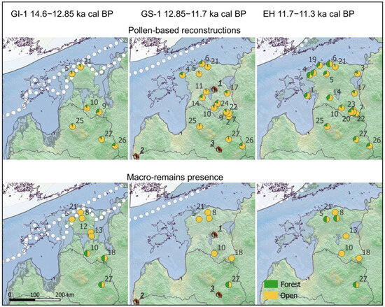 - Amon, L.; Veski, S.; Vassiljev, J. Tree Taxa Immigration to the Eastern Baltic Region, Southeastern Sector of Scandinavian Glaciation during the Late-Glacial Period (14,500-11,700 Cal. b.p.). Veg. Hist. Archaeobot. 2014, 23, 207–216. [Google Scholar] [CrossRef]