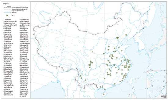 The city–WL spatial relationships of the 81 WLs (source: the Chinese map was downloaded from the “Standard Map Service System of the Ministry of Natural Resources”, with an approval number of GS(2019)4345. The rest were self-drawn by the author).