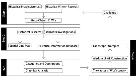 This article applied research methodologies from landscape history, specifically including the following 4 key steps (Figure 2): (1) Define the Study Object. This study identified 81 WLs that were clearly recorded as “West Lake” within China in historical records. (2) Build an Information Database. Combining historical research and fieldwork investigations, we completed their geographic location labeling in GIS using ArcGIS Pro 3.0 software. Additionally, information such as the names, excavation types, water source types, initial functions, city–WL spatial relationshipswas collected to establish a historical information database (for details, see Appendix A). (3) Categories, Descriptions, and Graphical Analysis. Based on quantitative data, qualitative descriptions were provided for different results, and morphological methods were employed for classification and illustration. (4) Propose Landscape Strategies. The historical landscape formation of WLs was unearthed, the historical wisdom in their construction was deciphered, and based on this, lake-scape construction strategies that meet the needs of modern cities were proposed.