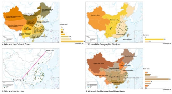 We superimposed the spatial distribution of the 81 WLs on ten major cultural zones in China and found that, in terms of geographical distribution, WLs are mainly concentrated in Jiangnan Water Town Cultural Zone, where the number of WLs (38) is nearly one-half of the country’s. The North China Plain Cultural Zone (15) and the South China Mazu Cultural Zone (13) are also relatively well distributed, followed by the Sichuan Basin Cultural Zone (7), and there are four and three WLs in the Loess Plateau Cultural Zone and the Yunnan–Guizhou Plateau Cultural Zone, respectively, and one is located in the Northeast Black Earth Cultural Zone (Figure 3a). There are 66 WLs concentrated in the eastern belt of China’s geographical divisions (Figure 3b). Almost all of the WLs are located in the southeastern half of the area divided by the Hu Line, with only the Lanzhou WL located northwest of this line (Figure 3c). In the figure titled “WLs and the National-Level River Basin”, it is clearly observable that WLs are predominantly distributed within the Yangtze River Basin (34), followed by the Southeastern River Basin (17). The number of WLs in the Huaihe River Basin (8), the Pearl River Basin (7), and the Yellow River Basin (7) is roughly equivalent. Additionally, there are 4 WLs located in the Haihe River Basin, 3 in the Southwest River Basin, and 1 in the Songliao River Basin (Figure 3d). Spatially, we can see that the distribution of these historical WLs is closely related to China’s history of water management and the development trend of water conservancy [47,48].