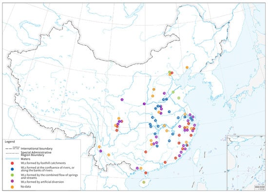 The water source types of the 81 WLs (source: the Chinese map was downloaded from the “Standard Map Service System of the Ministry of Natural Resources”, with an approval number of GS(2019)4345. The rest were self-drawn by the author).