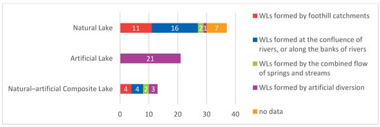 According to the existing literature, the excavation type of WLs can be divided into 3 categories: natural lakes, artificial lakes, and natural–artificial composite lakes. Apart from the 13 WLs that lack historical records, it is evident that natural lakes constitute the majority (52.2%). According to the type of water sources of WLs, WLs can be divided into 4 types: ① WLs formed by foothill catchments, ② WLs formed at the confluence of rivers or along the banks of rivers, ③ WLs formed by the combined flow of springs and streams, and ④ WLs formed by artificial diversion (Figure 5; for details, see Appendix A). Among these types of WLs, artificial WLs are all attributed to the ④ water source type, and natural WLs are developed from the lakes formed by mountain water or evolved from streams and bays (Figure 6).
