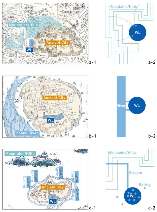Relationship between WLs and water sources. (a-1) Map analysis of WLs formed by foothill catchments (source: ancient map is sourced from Leshan prefectural chronicle, and the rest are self-drawn by the author). (a-2) Schematic diagrams of WLs formed by foothill catchments (source: self-drawn). (b-1) Map analysis of WLs formed at the confluence of rivers or along the banks of rivers (source: ancient map is sourced from Nanchang prefectural chronicle, and the rest are self-drawn by the author). (b-2) Schematic diagrams of WLs formed at the confluence of rivers or along the banks of rivers (source: self-drawn). (c-1) Map analysis of WLs formed by the combined flow of springs and streams (source: ancient map is sourced from Shandong Yellow River map, respectively, and the rest are self-drawn by the author). (c-2) Schematic diagrams of WLs formed by the combined flow of springs and streams (source: self-drawn).