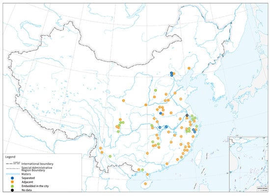 Due to the early functions of WLs in urban defense and water supply, there was a close relationship between WLs and their corresponding ancient cities. Based on the positional relationship between cities and WLs, they can be classified into 3 types: WLs that were separated from the city, WLs that were adjacent to the city, and WLs that were embedded in the city (Figure 8; for details, see Appendix A).