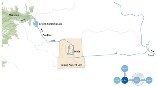 WLs that were separated from the city maintain a certain spatial distance from the city and are always connected to the urban water system network through rivers, ditches, and canals. Beijing Kunming Lake, which was located far from the Beijing ancient city, was connected to the lake and water systems within the city via the Zao River, ultimately linking up to the canal. On a larger spatial scale, together with the mountains in the western suburbs, Beijing Kunming Lake formed a scenic landscape pattern of “Mountains/Hills–Spring-WL–River–City–Water (Canal)” (Figure 9).