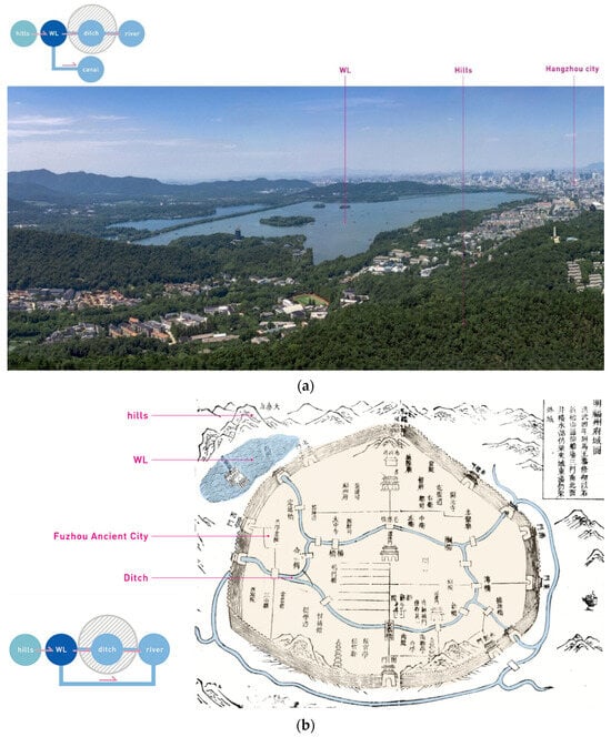 WLs that were adjacent to the city are closely related to the development of cities. The survival and development of these WLs are often related to the urban population or the size of the city. Because of the important functions of Hangzhou WL, such as flood storage, water supply, agriculture, and fisheries, as well as the landscape, Hangzhou has always had a “city–WL” landscape, “being surrounded by mountains on three sides and adjacent to the city on one side” (Figure 10a). At the end of the Tang Dynasty, with the expansion of Fuzhou city and the construction of interconnected water systems both inside and outside the city, Fuzhou WL, on the one hand, served as a reservoir storage lake to channel water for flood relief and supply water to the city and surrounding fields; on the other hand, it constituted a defense for the city together with the city walls and water system shorelines [54,55]. Despite the continuous expansion and development of the city during the Song, Ming, and Qing dynasties, the scenic pattern of “Mountains/Hills–WL–City–River” has remained consistent and unbroken on a regional scale (Figure 10b).