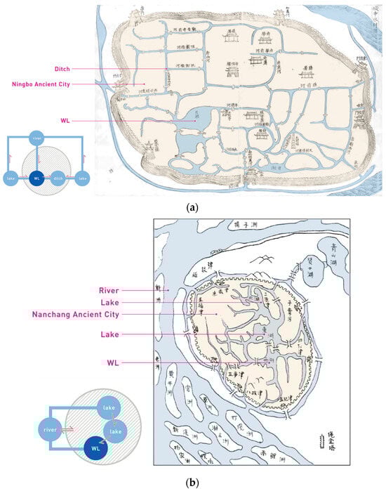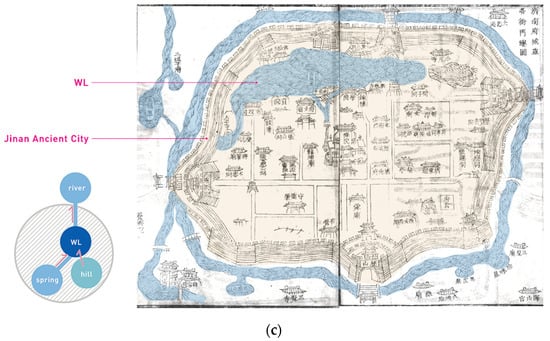 WLs that were embedded in the city have a close interconnection with the city’s water system. Ningbo WL, with the function of storing freshwater in the urban water ecosystem, constitutes the river network pattern of “three rivers, six ditches, and one lake nestled in the city center” with other rivers and ponds in the city (Figure 11a). To address the waterlogging issues of Nanchang WL during the Tang Dynasty, inner and outer sluice gates and multiple drainage canals were constructed. These canals connected Nanchang WL with the surrounding river and ditch systems, evolving into a city water system featuring “three lakes and nine ditches” by the Qing Dynasty (Figure 11b). Jinan WL Prefecture boasts a relatively vast water surface, and as the city expanded, it was gradually incorporated within the ancient city. This integration created a unique city–WL landscape for Jinan, often described as “mountains encircle the city and half of the inner space is occupied by Jinan WL” (Figure 11c).