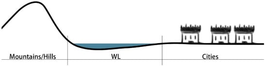 Based on the relationship between WLs and their water sources, as well as their spatial relationships with cities, it can be observed that at the regional scale, the scenery of WLs was characterized by either “Mountains/Hills(–Water)–WL(–Water)–Cities(–Water, River, Sea)” or “WL(–Water)–Cities(–Water, River, Sea)” (Figure 12).
