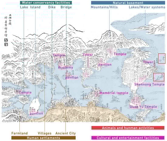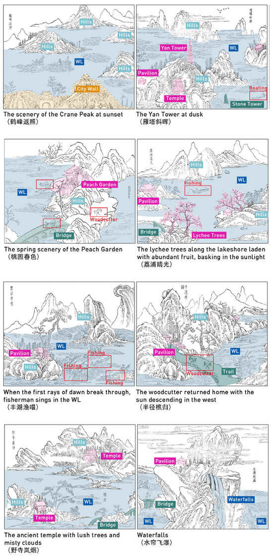 Numerous historical records show that the scenic elements of WLs include mountains/hills, waterfalls, islands, bridges, towers, temples, and plants, as well as scenes of animal and human activities. These landscape elements can be categorized into 7 types: natural basements, water conservancy facilities, human settlements, secularization, landscape architecture, and animal and human activities (Table 2). Similarly, in the images of WLs (Figure 13), we can also observe the depiction of elements such as mountains/hills, lakes/water systems, bridges, dikes, islands, towers, temples, and villages.
