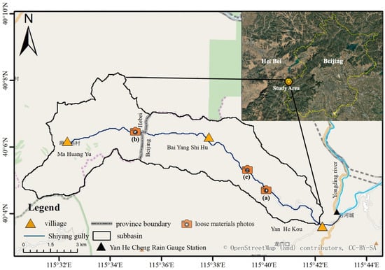Shiyang Gully is situated along the border between Beijing and Hebei Province and serves as a subbasin of the Yongding River (Figure 1). The upper reaches of Shiyang Gully are primarily situated within Hebei Province, characterized by relatively open terrain with an east–west orientation and numerous long tributaries that facilitate rainfall convergence. In contrast, the middle and lower reaches in the Beijing section are narrower and oriented in a northwest–southeast direction, with shorter tributaries [,]. The watershed covers an area of 43.76 km2, with a maximum elevation of 1898 m and an outlet elevation of 451 m, giving a relative height difference of 1447 m. The main gully stretches 18 km in length, with an average channel gradient of 67.8‰.