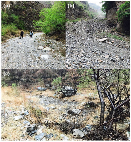 The main gully is 18 km long, with an average channel gradient of 67.8‰. The region is marked by well-developed faults and intense tectonic activity, and its geomorphology is predominantly mountainous, with steep slopes on both sides of the channel. The lithology is mainly composed of gray to dark gray dolomite from the Jixian System Wumishan Formation, along with quartz monzonite in the northern region [,]. Shiyang Gully contains a large number of loose materials, including alluvial deposits, fractured rock masses, and gravel. Among these, the sediment impacted by flowing water is the most widely distributed (Figure 2a,c), while the fractured rock masses are mostly found along the sides of the gully or in tributaries with steeper slopes (Figure 2b). Three main villages are located within the gully: Mahuangyu Village in Hebei and Baiyangshihu and Yanhekou Villages in Beijing. Transportation within the gully is limited to a simple gravel road that forms part of a national trail. This route is a popular off-road path among tourists from both Beijing and Hebei.