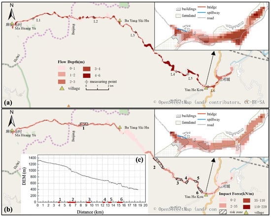 Areas experiencing the greatest debris flow impact were identified as high-risk zones. A total of six high-risk zones were recognized (Figure 4b) and their locations within the channel were visualized using cross-sectional profiles (Figure 4c). These areas were primarily concentrated in regions with significant terrain variation, characterized by steep slopes and narrow channels, which contributed to increased flow velocity and impact force. However, due to Yanhekou Village’s location downstream of Shiyang Gully, the debris flow energy was significantly reduced by a combination of upstream vegetation (trees, shrubs, and grass) and channel protection measures along a 2 km stretch. As a result, the impact force of the debris flow at Yanhekou Village ranged between 100 and 10,000 N/m (Figure 4b).