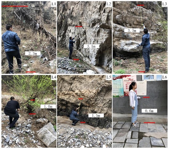 Height measurement of debris flow traces at typical locations in Shiyang Gully (taken in April 2018). (L1–L6) Measuring point (corresponding positions are indicated in Figure 4a).