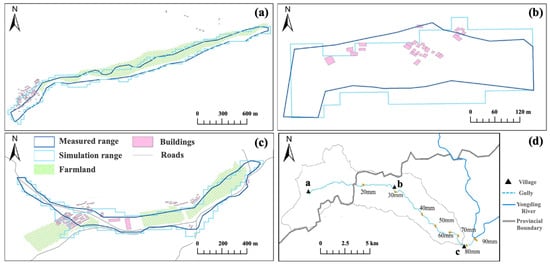 Comparison of the simulation results of debris flow range and the measured range. (a–c) Represent Mahuangyu Village, Baiyangshihu Village, and Yanhekou Village. (d) The location of each village within the entire study area.