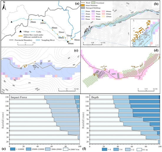 Simulation of debris flow hazards under different cumulative rainfall levels. (a) Debris flow reach within Shiyang Gully under varying rainfall levels. (b–d) Inundation ranges of Mahuangyu Village, Baiyangshihu Village, and Yanhekou Village under different rainfall levels. (e,f) Statistical analysis of debris flow impact force and depth variations with rainfall levels.