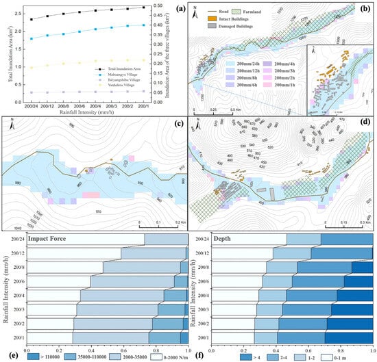 Simulation of debris flow hazards under different rainfall intensity levels. (a) Changes in the total debris flow inundation area and the inundation area of three villages in Shiyanggou under different rainfall intensities. (b–d) Inundation ranges of Mahuangyu Village, Baiyangshihu Village, and Yanhekou Village under different rainfall intensity levels. (e,f) Statistical analysis of debris flow impact force and depth variations with rainfall intensity levels.