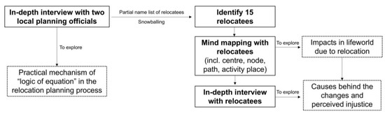 The studied relocation project was completed in 2016, as a demonstrative project under this 15-minute city concept. Approximately 106 households were relocated from the Jiangpu Neighborhood, an old bungalow neighborhood in Yangpu, to Neighborhood S, a large, gated high-rise residential compound less than 4 kilometers away, designated for the displaced residents. According to interviews, the planners believed that, according to the official “Planning Guidance of 15-Minute Community Life Circle” and relevant district government planning codes, the built environment had been improved after the relocation in terms of the accessibility to mainstream public services, such as education, recreation, and transportation. The new residential compound even offered higher-level transportation facilities, such as access to an underground station, a sports stadium, and a larger park. Hence, this case provided an opportunity to assess whether the distributional equity could effectively mitigate the impacts of relocation on the lifeworlds of those displaced. The research procedures are revealed in the following diagram (Figure 2).