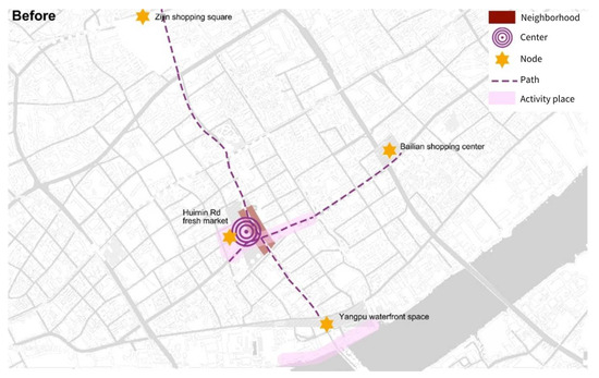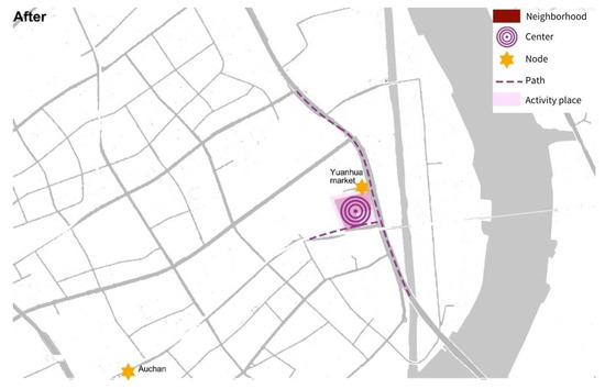 This study employed mind mapping and in-depth interviews to explore how the relocation affected the intangible aspects of the residents’ lifeworlds. Drawing on Woodcock et al.’s [62] research on residents’ spatial perceptions, which is itself based on Lynch’s Image of the City theory, the study modeled the residents’ spatial perceptions and interactions as mind maps consisting of centers, nodes (important facilities), paths (key roads), and activity places. These mind maps (for examples, see Figure 3 and Figure 4) were used to visualize changes in the residents’ intangible spatial perceptions and capabilities before and after relocation. While this research measured some quantitative changes of the mind maps, such as the area of activity areas and the diversity of nodes, it is only intended to show general socio-spatial changes, with no intent to define statistical values, owing to the vagueness of people’s mind maps of the dimensions and changes of their activity areas.