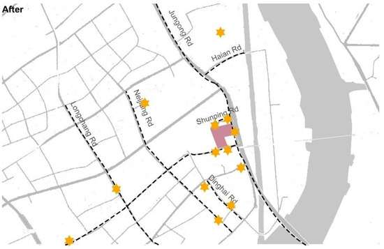 Additionally, the diversity of the paths and nodes decreased (Figure 5 and Figure 6). While the authors recognized the potential impacts of walkability and built patterns on people’s daily activities before and after the relocation, most of the interviewees applied clear negative values to their new surroundings, and many nodes with the same functions, such as parks, were under-used after the relocation. Also, the difference in the built environment, in principle, was also part of the “evaluation”. Furthermore, the interviewees had less individualized paths and nodes, such as to chestnut shops and card-game clubs, after the resettlement, despite the fact that most of these goods and services could be found within the community life-circle boundary.
