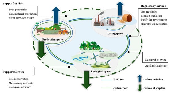 Imbalances in carbon metabolism not only directly contribute to climate change but also indirectly affect ecosystem services through various pathways. For instance, excessive carbon emissions exacerbate climate change and disrupt climate patterns, which, in turn, destabilize ecosystems, reduce carbon sequestration capacity, and weaken the effectiveness of carbon sinks, ultimately diminishing the value of ecosystem services []. Conversely, healthy ecosystems can effectively absorb carbon dioxide and enhance carbon storage capacity, thereby mitigating the impacts of climate change. The economic value of their carbon sequestration services can be quantified through the ecosystem service value (ESV) []. It is important to note that the relationship between carbon metabolism and ecosystem service value is not limited to carbon sequestration; it is also closely linked to the evolution of PLE space. Urbanization and changes in agricultural land use are often accompanied by alterations in land cover and ecosystem types, which directly influence the sources and intensity of carbon metabolism while also changing the type and spatial distribution of ecosystem services []. The reduction in ecological space may lead to an imbalance in carbon metabolism, resulting in increased carbon emissions and the degradation of carbon storage functions, thus lowering the value of ecosystem services. Therefore, carbon metabolism and ecosystem service value interact and influence each other, with healthy ecosystems regulating carbon metabolism through their carbon sink functions []. To achieve the “dual-carbon” goal, in-depth studies of the spatial and temporal relationship between these factors provide a theoretical foundation for the development of more scientifically informed environmental policies and carbon reduction strategies [].