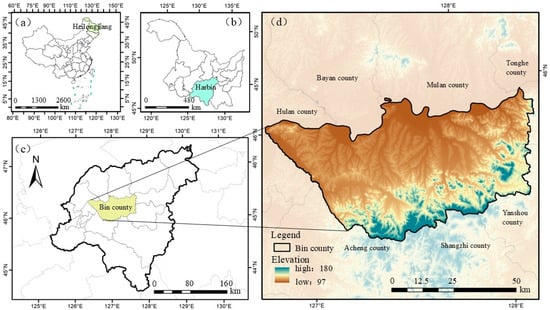 (a) Location map of Heilongjiang province. (b) Location map of Harbin city. (c) Location map of Bin county. (d) Map of the research area.