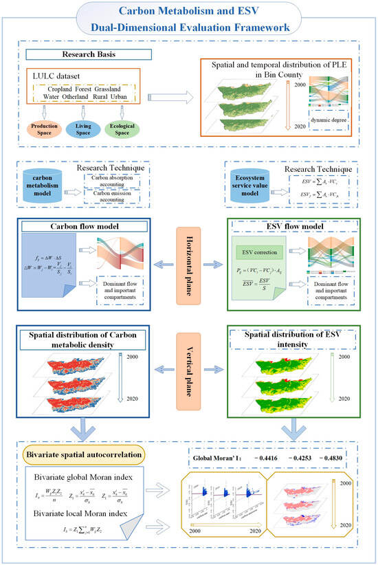 This study constructs a dual-dimensional evaluation for carbon metabolism and ecosystem service value (ESV) based on the “Ecology–Production–Life” (PLE) classification framework, analyzing their spatial and temporal dynamics in both horizontal and vertical dimensions. The flow of carbon and ESV across different ecosystems is quantified to reveal their spatial and temporal evolution, while spatial autocorrelation analysis is employed to explore the interaction mechanisms between carbon metabolism and ESV. The comprehensive assessment model integrates vertical and horizontal dimensions to provide a holistic understanding of carbon metabolism and ESV. Additionally, future strategies for sustainable development in Bin County are proposed for different sub-regions, offering a scientific basis and policy recommendations for promoting ecological sustainability in agricultural counties within the black soil region, with Bin County as a representative case.