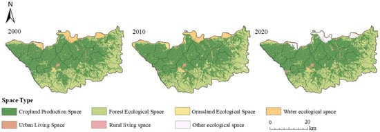 In this study, land use information for Bin County in Harbin City was processed using ArcGIS, utilizing national land use data from 2000, 2010, and 2020. The data were classified into seven types of production–living–ecological (PLE) space (Figure 4). The results indicate that between 2000 and 2020, land use types in Bin County were predominantly characterized by cropland production space and forest ecological space, with the overall area remaining relatively stable and exhibiting minor local changes. Specifically, the area of agricultural production space experienced a slight decline from 2000 to 2010, followed by a continued decrease from 2010 to 2020. Forest ecological space, primarily concentrated in the southeast, remained stable overall. The area of grassland ecological space saw a significant increase from 2000 to 2010 but decreased in the northwest from 2010 to 2020. Additionally, the water ecological space remained stable during 2000–2010 but experienced a significant decline from 2010 to 2020, negatively impacting the overall ecosystem. Urban living space is concentrated in township centers, indicating population concentration, while rural living space, though more significant, is irregularly distributed, showing little change over the study period.