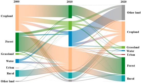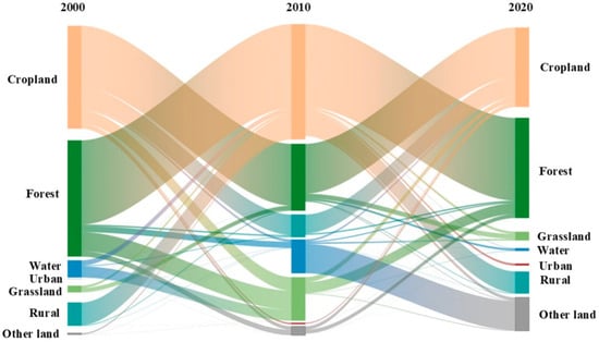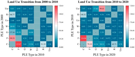 By combining the PLE space transfer heat map (Figure 5) with the Sankey diagram (Figure 6), it is evident that between 2000 and 2010, cropland production space in Bin County primarily flowed into forest ecological space and rural residents’ living space, covering areas of 99.53 km2 and 46.77 km2, respectively. Concurrently, forest ecological space converted to cropland production space, with an area of 125.87 km2, indicating a gradual increase in the demand for agricultural land. Additionally, the change in grassland primarily originated from cropland production space, with an area of 37.16 km2. In contrast, the area transferred out was relatively small, reflecting the local management unit’s focus on ecological protection. Rural living space transformed 51.19 km2 into cropland production space, whereas cropland also transferred 46.77 km2 into rural living space. The transfer in and out of areas was roughly equivalent, indicating that the development of agricultural production and residents’ living conditions has remained stable.