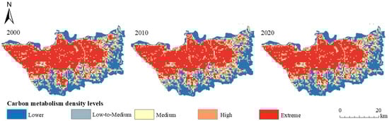 Carbon is the material basis for various human socio-economic activities and a product of emissions. It is a crucial indicator of the coupled development and utilization of regional water, soil, and energy resources. Carbon metabolism refers to the flow of carbon between the biosphere, atmosphere, and urban systems, encompassing both carbon emission and absorption processes [,]. Current academic research on carbon metabolism primarily focuses on land use types with differing carbon sink functions at the urban level. Accounting methods vary based on their specific applications []; among these, carbon emission factor methods, model estimation methods, and remote sensing and mapping estimation methods have become the predominant approaches in the relevant research [,]. This study primarily focuses on the characteristics of the spatial distribution of carbon metabolism [], the processes of carbon flow [,,], the underlying driving mechanisms [], and scenario modeling [].