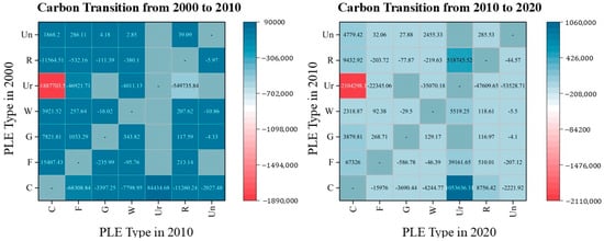 Based on the accounting of carbon emissions and absorption processes across various types of space, carbon fluxes on the vertical scale are established through the overall spatial cross-section at a single point in time. Consequently, the carbon fluxes of the PLE space are calculated by aggregating the total carbon emissions and carbon absorption within these spaces. In accordance with previous research methods [,], net carbon emission per unit area is defined as net carbon metabolism density. To quantify the carbon metabolism capacity of different spaces and to measure the resulting carbon fluxes and their directional changes within the PLE space, this study employs the difference in carbon metabolism density alongside the area of PLE space transfer. The calculation formula is as follows:
