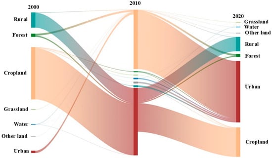 Sankey diagram of land use transfer in PLE space in Bin County from 2000 to 2020.