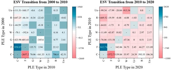 As shown in Table 12, from 2000 to 2010, the ecosystem service value (ESV) gained was CNY 295.667 billion, while the losses amounted to CNY 549.939 billion, resulting in a total net loss of CNY 254.272 billion. The conversion of cropland production space to forest ecological space was the primary source of ESV gain during this period, accounting for 68.98% of the total gain. Conversely, the loss of various types of ecological space, particularly forest ecological space, was the main driver of ESV loss, contributing to approximately 48.32% of the total loss.