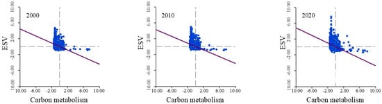 The study utilized GeoDa 1.18 software to analyze the ecosystem service value (ESV) and carbon metabolic density data for Bin County at three key time points, 2000, 2010, and 2020, using a 1 km × 1 km grid cell framework. This analysis treated ESV as the independent variable, while carbon metabolic density values were the dependent variable.