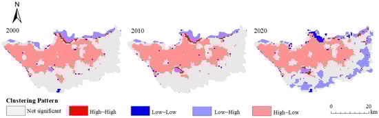 Based on the bivariate LISA plot (Figure 14), the high–low clusters in 2000 and 2010 were predominantly located in the central and northwestern regions of Bin County. This area primarily consists of plains, where the high–low clusters are distributed in a fragmented manner, showing a high degree of spatial coincidence with cropland production. In 2020, the distribution of high and low clusters remained similar to that of the previous two periods; however, the low and high clusters began to expand toward the south and east of Bin County. In these areas, mountains and hills limit agricultural use, resulting in a predominance of forest land associated with lower carbon emission intensity and higher ecosystem service value. Notably, the low–low clustering in 2020 exhibited a significantly larger distribution area compared to the earlier periods. This increase can be attributed to changes in other ecological spaces, primarily unused land, which generates lower carbon emissions and possesses a relatively low ecosystem service value.