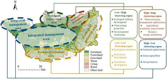 Based on the results of the correlation study between carbon metabolism and ecosystem service value of PLE space, it can be found that the potential of ecological value enhancement and environmental pressure is different for different space types. Based on the results of the previous study, the area is divided according to the differences in clustering patterns. Meanwhile, combined with the study area’s natural, economic, and social factors, targeted zoning management measures are formulated to rationally utilize different ecosystems’ ecological efficiency and resource allocation to provide theoretical support for the healthy development of Bin County’s socio-economy (Figure 15).