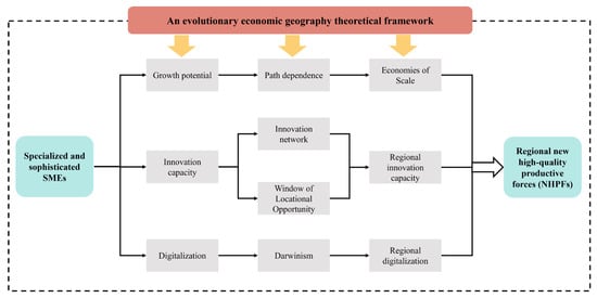 It is widely acknowledged that the global economy is experiencing secular stagnation, with major economies stabilizing at their weakest levels in decades []. From 2024 to 2030, global economic growth is projected to average approximately 3% []. Growth in advanced economies is expected to decelerate further, with overall growth rates likely to fall below 2%, marking a decline relative to the average growth rate observed over the past five decades. Downward risks are predominant, driven by a contraction in international trade and investment, along with a rise in trade protectionism and unilateralism. The global supply chains are undergoing rapid restructuring, characterized by trends toward diversification, regionalization, greening, and digitalization []. The traditional economic growth model is increasingly inadequate in addressing modern society’s demands for innovation, efficiency, and sustainable development. In this context, promoting high-quality economic growth has become a central concern for both policymakers and business entities worldwide. China, the world’s second-largest economy and a global manufacturing leader, is undergoing a significant transformation to address these emerging demands. Over the past decade, in its pursuit to modernize traditional industries and cultivate emerging sectors, the Chinese government has summarized the concept and crafted strategic policies for new high-quality productive forces (NHPFs). The concept of NHPFs not only encompasses the enhancement of productivity but also signifies a fundamental shift toward a technological revolution in productivity. This transformation is reflected in a more efficient mode of production organization, characterized by improved coordination both internally and externally, leveraging advanced technologies and digitalization []. It emphasizes the integration of innovation and highly skilled labor, as well as the widespread application of digital technologies across both emerging and mature industries. This aligns with Romer’s [] endogenous growth theories, which posit that long-term productivity growth is driven by knowledge and innovation rather than mere capital accumulation. However, the application of current theories to the regional dynamics of specialized and sophisticated SMEs (SpecSof SMEs), particularly in the economic geography of China, has not been extensively explored. This gap underscores the necessity for an investigation into the spatial implications of NHPFs, which could potentially redefine the pathways for regional economic development.