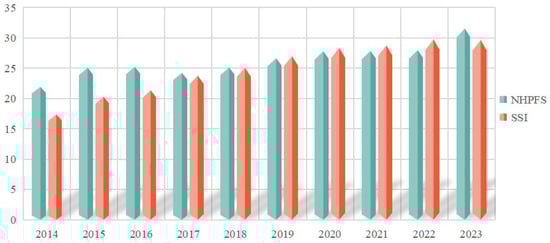 Figure 4 illustrates that between 2014 and 2023, both the NHPFS and the SSI in China steadily increased, with the two indices gradually converging at different stages. From 2014 to 2016, the NHPFS was significantly higher than the SSI, reflecting a reality in which early-stage specialized and sophisticated enterprises achieved high levels of productivity driven by policies and resources while exhibiting weak innovation capabilities. Starting in 2016, the SSI experienced accelerated growth, particularly after 2019. The value approach of both indexes indicates that the improvement in productivity during this phase came from enhanced capabilities like innovation or digitalization among specialized and sophisticated enterprises. The synergistic development of the NHPFS and the SSI aligns with the endogenous growth model, suggesting that technological advancements and innovation capabilities are crucial forces driving sustained economic development []. This trend indicates the steady progress of the Chinese economy toward high-quality development and innovation-driven growth.
