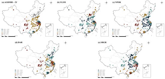 Figure 5 illustrates the GWR results, showing the differentiated impact of the growth potential components of SpecSof SMEs on NHPFs. First, the results reveal a clear spatial clustering relationship, with adjoining regions exhibiting consistent trends and similar intensities in how the growth potential of SpecSof SMEs influences NHFPs. As shown in Figure 5a, there is an overall positive correlation between the AGRMBI-2Y and NHFPs. In the central and western regions, as well as in most of the eastern regions, AGRMBI-2Y is positively correlated with NHPFs, particularly in provinces like Zhejiang, Shaanxi, and Sichuan. This trend may be attributed to the relatively mature market mechanisms and favorable economic environments in these areas, which facilitate the effective transformation of income growth into productivity enhancement. Conversely, a negative correlation is observed in the northeastern region and certain eastern areas, such as Jiangsu, Guangdong, and parts of Guangxi. In low-income and labor-intensive northeastern regions, productivity improvements primarily depend on increases in labor or the utilization of low-cost labor resources. However, this rise in income leads to a decrease in NHPFs, resulting in a slight negative correlation between AGRMBI-2Y and NHPFs []. In more economically developed eastern regions, some SpecSof SMEs experience intense market competition, which compresses their revenue []. As depicted in Figure 5b, there is an overall positive correlation between the yield of labor-share market (YLSM) and NHPFs, though its promoting effect is limited. This limitation may partly stem from the presence of long-established companies among SpecSof SMEs, which tend to favor stable development, leading to a phenomenon of “path dependence”. Over time, a firm’s innovation capacity and flexibility may weaken as the years since going public increase [,]. This phenomenon is particularly evident in certain areas of the eastern and central regions, such as parts of Jiangsu, Henan, and Shaanxi. Despite the stagnation or decline in productivity growth associated with the path dependence of larger companies, SpecSof SMEs continue to contribute modestly to regional productivity growth. Notably, the northeastern region exhibits a strong positive correlation overall, attributed to its imperfect capital market and high financing costs. Companies with longer listing durations often secure financing at lower costs, enabling productivity investments []. Figure 5c reveals intriguing differentiation in the relationship between the net profit operating ratio (NPOR) and NHPFs. A clear negative relationship is spatially concentrated in regions such as Henan, Hubei, and Jiangxi, where intense market competition and high price elasticity make it challenging for firms to gain pricing power. In this context, even with productivity improvements, profit margins may become economically unviable []. Conversely, in other regions, the NPOR shows a positive effect on NHPFs. In Figure 5d, most regions exhibit a negative relationship between the debt-to-asset ratio (DAR) and NHPFs, with positive correlations appearing only in parts of the western regions and areas in Jiangsu and Zhejiang that are farther from the center. The negative correlation in the western regions is attributed to their relatively singular financing channels, where firms primarily rely on traditional debt financing tools, such as bank loans, to secure investments for productivity enhancement []. In some eastern regions, the negative correlation arises because higher leverage ratios are typically accompanied by stronger management capabilities and more stable repayment abilities, allowing firms to increase their DAR to enhance technology and improve NHPFs []. Overall, as shown in Figure 5e, there is a positive correlation, with only a few provinces, such as Hebei, Hubei, and Shanghai, exhibiting negative correlations. SpecSof SMEs in Shanghai have matured in enhancing output efficiency and technological innovation, leading to a pronounced phenomenon of diminishing marginal returns. The negative correlation in the central region is a consequence of the previously mentioned income increases derived solely from increased labor input, resulting in a decline in NHPFs.