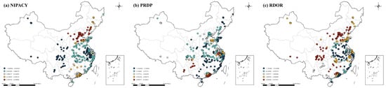 Figure 6 illustrates the spatiotemporal correlation between the innovation capability of SpecSof SMEs and new productive forces. As shown in Figure 6a, there is an overall positive correlation between the Innovation Capability Index (NIPACY) and NHPFs. However, the western region and certain areas in Jiangsu and Zhejiang exhibit a negative correlation. The geographic distribution of SpecSof SMEs in the western region is scattered, with insufficient industrial and supply chains, leading to ineffective conversion of patent outputs into actual productivity. High R&D expenditures (including both human and financial resources) may crowd out other investments that could more directly enhance productivity, thereby suppressing short-term productivity growth []. The negative correlation observed in Jiangsu and Zhejiang can be attributed to two main factors. First, some enterprises apply for invention patents as a form of technological protection for future innovations, which may not translate into immediate productivity gains []. SpecSof SMEs, particularly those focused on niche industries, face long cycles and significant challenges in conversion, meaning that increases in patent applications do not necessarily lead to immediate productivity gains. Additionally, the application and maintenance of invention patents incur management costs, including technology protection, maintenance fees, and compliance management. For some enterprises, the rise in patent applications does not effectively convert into productivity, resulting in a phenomenon known as “strategic accumulation of patents”, where resources are diverted to the maintenance and management of patents []. In Figure 6b, both PRDP and NHPFs exhibit a positive relationship and show a uniform distribution, with Guangdong demonstrating a strong proximity effect. This indicates that the agglomeration of R&D personnel fosters knowledge spillovers within the regional network, particularly in high-tech parks and innovation clusters in Guangdong []. A higher proportion of R&D personnel promotes knowledge sharing and transfer, further enhancing the collective improvement of regional NHPFs. Figure 6c presents the spatiotemporal relationship between the R&D output ratio (RDOR) and NHPFs. Overall, there is a significant positive correlation; however, some central and eastern regions, such as Zhejiang, Fujian, and Hubei, show slight negative correlations. This can be attributed to the lagging nature of R&D investments, where increased R&D expenditure may not immediately reflect enhancements in productivity [].