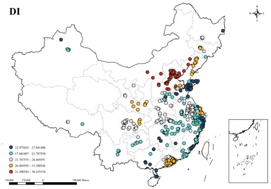The NHPF index indicates not only production efficiency but also multidimensional factors such as market potential, innovation capacity, and technology application []. The characteristics of SpecSof SMEs align closely with these factors, providing a comprehensive reflection of their performance within a high-quality growth model. In contrast to giant corporations, SpecSof SMEs more directly illustrate the transition of regional economies from quantity growth to quality growth []. To comprehensively portray the various aspects of SME development, we integrated three key characteristics based on the Ministry of Industry and Information Technology’s indicator system [] for SpecSof SMEs: development potential, innovation capability, and digitalization. For instance, the development potential of these SMEs can be broken down into different dimensions, including the proportion of main business revenue, the average growth rate of main business revenue over the past two years, and the net profit margin relative to operating income. Secondary indicators are used to assess the market performance and financial health of the firm’s core business. By evaluating their potential for sustained expansion and market advantages, we can reveal the growth space and risk resilience of these enterprises. On the basis of relevant literature, we developed a development potential index for SpecSof SMEs by weighting these secondary indicators. Innovation capacity is a crucial component of the core competitiveness of SpecSof SMEs, determining their sustainability and differentiated advantages in a technology-driven market. Secondary indicators, such as the number of invention patent applications in the current year, the proportion of R&D personnel, and the ratio of R&D investment to operating income, reflect the firm’s investment in technological R&D, intellectual property creation, and innovation team development—factors that directly impact the firm’s breakthroughs and market prospects in the technology sector. Digitalization plays a particularly significant role in the development of SpecSof SMEs. By leveraging technologies such as big data, cloud computing, and the industrial internet, digitalization enhances the production efficiency and flexibility of these enterprises, serving as a vital avenue for increasing productivity. Selecting authoritative digitalization indices as indicators for this dimension allows for effective quantification of firms’ investments in informatization and intelligentization, as well as their level of digital maturity.