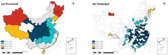 Moreover, the existing literature has extensively examined the factors influencing the spatial diffusion of regional NHPFs across different geographic scales. Iammarino and McCann [], Feldman and Kogler [], and Hall [] have highlighted the role of geographical proximity in this process, emphasizing that the effects of spatial diffusion are more pronounced at smaller scales, such as the firm and municipal levels, compared with broader provincial or regional levels. Similarly, studies by Figueiredo et al. [] and Anselin et al. [] have quantified the impact of distance on diffusion, suggesting a significant distance decay effect. This implies that firms at the enterprise and municipal levels benefit more from improvements in their neighbors’ NHPFs, as proximity enhances the transfer of knowledge and capabilities. Holl and Rama [] further argued that SMEs rely heavily on informal networks and inter-firm partnerships, which facilitate spatial diffusion. Geographical proximity allows SpecSof SMEs to share their distinct expertise with nearby economic entities, reinforcing the spatial diffusion processes that drive NHPFs’ growth at smaller geographic scales. This study seeks to examine the influence of performance at smaller, localized geographic scales on broader provincial and regional dynamics and how these interactions ultimately shape the distribution of SpecSof SMEs and overall NHPF growth.