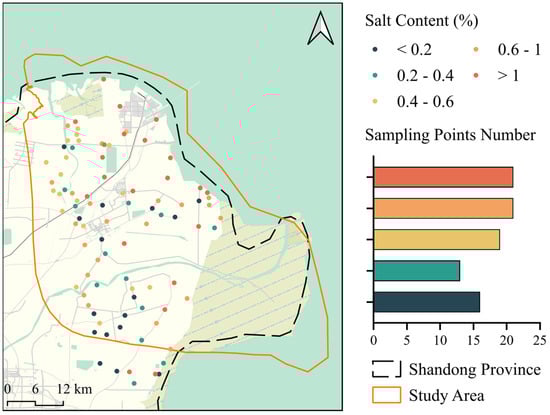 Soil samples were collected randomly and uniformly in July 2021 in the top soil layer of the Yangtze River Delta region, totaling 90 soil sampling points (Figure 1). The soil samples were organized and brought back to the laboratory, then the samples were air-dried, ground, sieved through a pore size of 2 mm, and mixed with a soil–water mass ratio of 1:5, and the determination solution was extracted after shaking and filtering; the soil conductivity was determined using a portable EC110 conductivity meter, and then the salinity was calculated and statistically analyzed according to empirical formulas of the previous results [22]. According to the grading standards of soil salinization degrees in the recent and modern YRD [23], the sampling points were classified into salinization grades, of which 16 points were non-salinized soils (<0.2% of total salt), 13 points were mildly salinized soils (0.2–0.4% of total salt), 19 points were moderately salinized soils (0.4–0.6% of total salt), 21 points were severely salinized soils (0.6~1.0% total salt), and 21 points were saline soils (>1.0% total salt). The statistics of the salinization degree of each sampling point are shown in Figure 2. Non-saline soils and mildly saline soils are widely distributed in the southwest part of the study area, while moderately saline soils and heavily saline soils are distributed in a band in the north coastal area in the east part of the study area, with the presence of a small amount of non-saline soils, and the distribution of sampling points according to the division of salinity grade is shown in Figure 2.